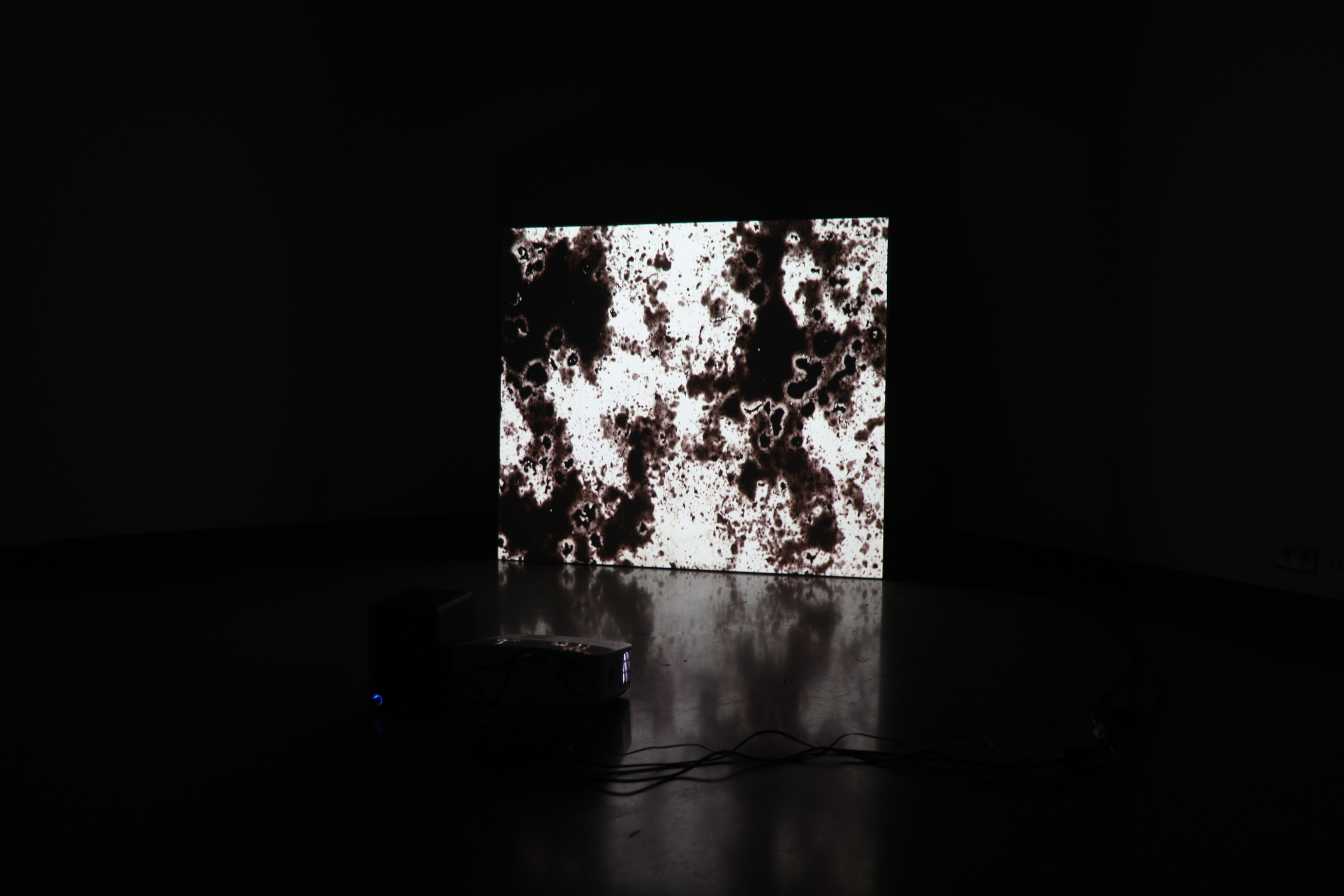 Lightbox with CNC engraving, inkjet print of a large format photograph, digital scan and optical sound from contact print of dirt collected at Red Gate Woods, IL on 16mm leader, scent of fresh dirt